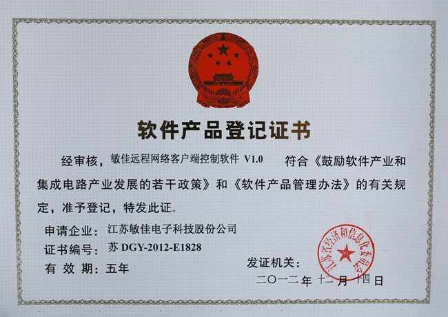 2012年1214號,我公司獲得了由江蘇省經濟和信息化委員會頒發的軟件產品登記證書。此次,又有二個產品經審核符合《鼓勵軟件產業和集成電路產業發展的若干政策》和《軟件產品管理辦法》的有關規定,被認定為軟件產品,其中包括:敏佳雷達測試云臺攝像機控制軟件V1.0、敏佳遠程網絡客戶端控制軟件V1.0